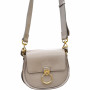 Le petit sac Tess se distingue par sa forme ronde, bordée par une bandoulière. Ce modèle est confectionné en cuir de veau lisse et veau velours, pour un jeu de contrastes délicat. Son anneau signature et ses détails métalliques or et argent soulignent son raffinement.
