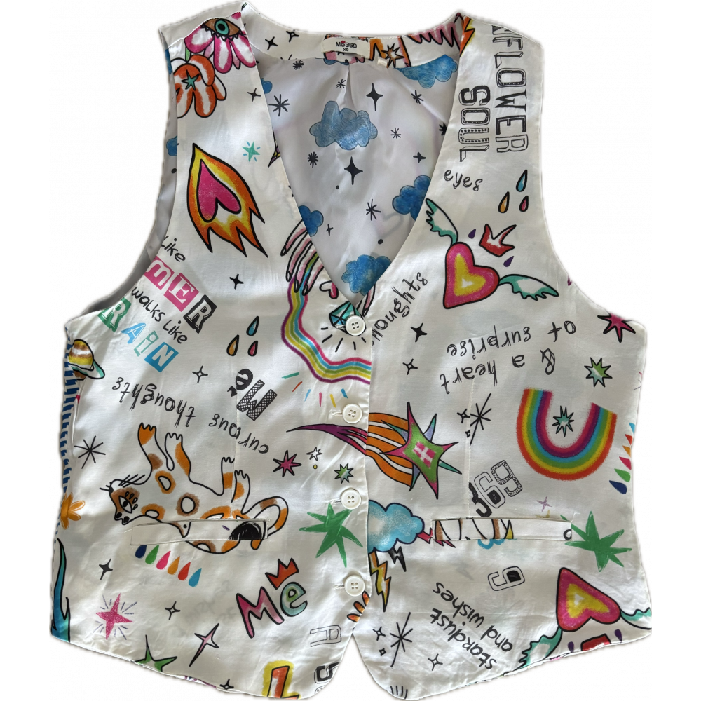 Gilet 100 % viscose selon notre modèle des Lumières. L'avant et le dos sont deux motifs différents. Col en V, fermeture à quatre boutons. Associez-le à notre jupe portefeuille Amber assortie pour un look cool psychédélique.