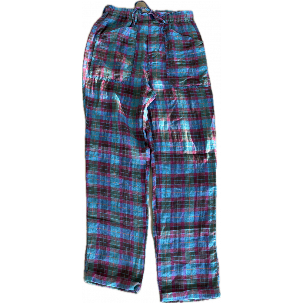 Pantalon à carreaux en lin à dominante bleue