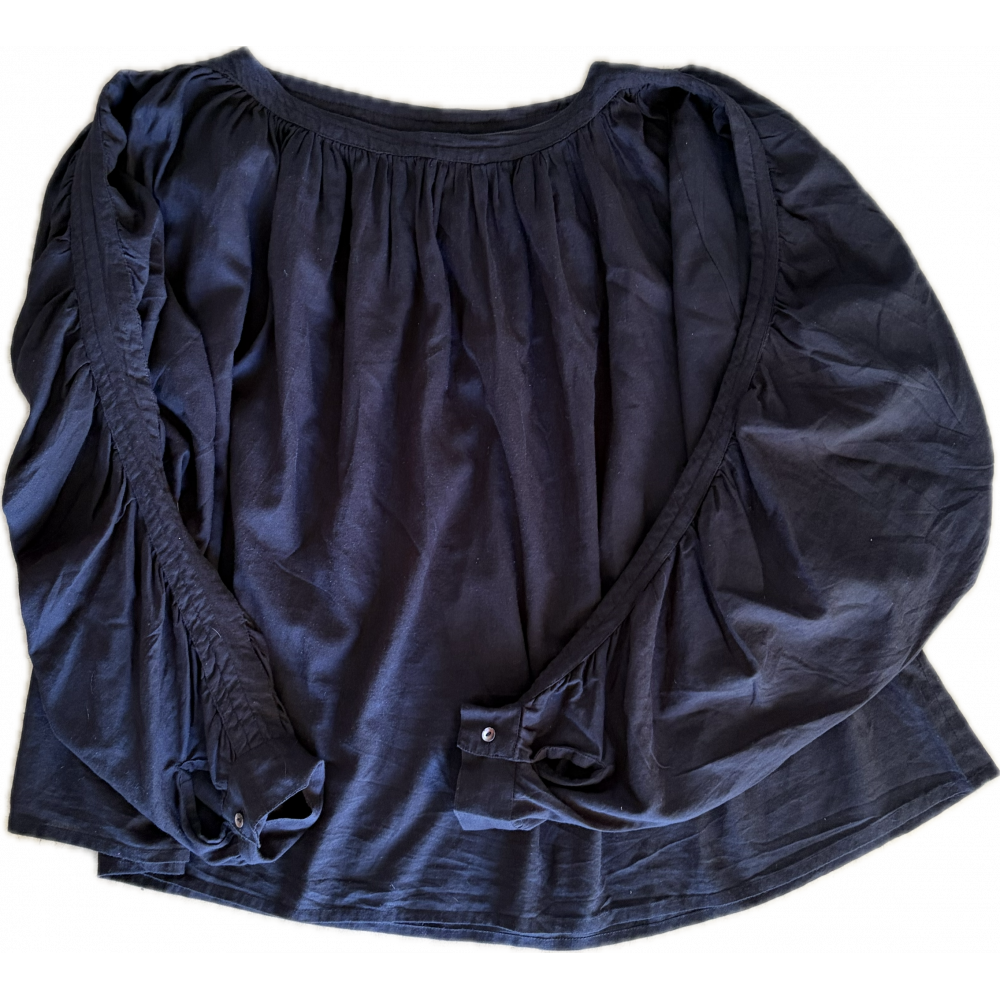 Coupe ample. Manches ballon froncées. Double ganse à la couture. Boutons aux poignets en nacre naturelle.