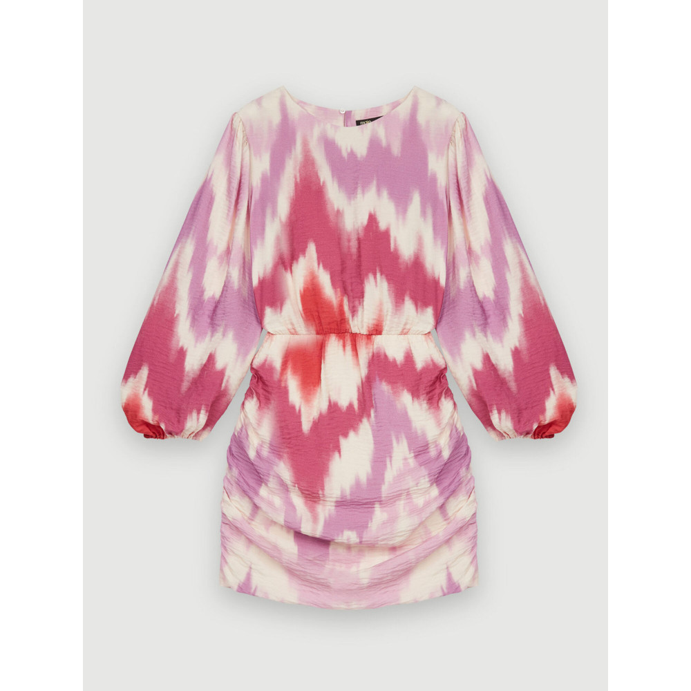 Robe courte ajustée en mélange de viscose fluide. Impression de cravate et de teinture. Manches longues et amples, élastiques à l'ourlet. Doublure et ceinture. Encolure ronde. Fermeture éclair dissimulée à l'arrière. S'ouvre à l'arrière avec un bouton et une sangle élastique en haut. Drapé sur la jupe.