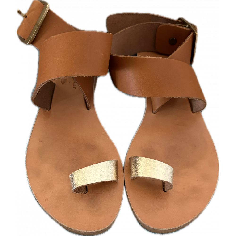 Sandale en cuir souple avec bague d'orteil. Une large bride confortable entoure la cheville et se ferme avec une boucle.