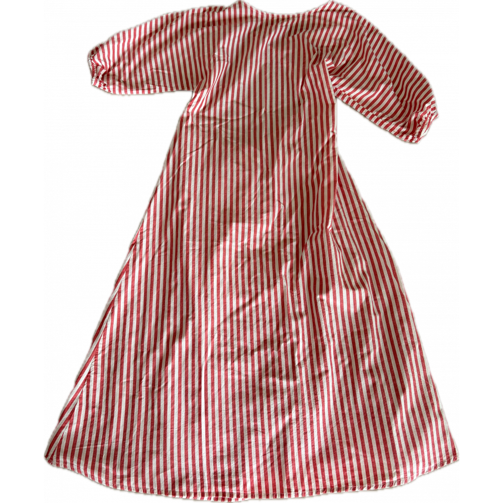 La robe Mendez présente une silhouette féminine et évasée en reste de coton rayé. Les manches et le devant sont fabriqués comme une seule pièce sans couture, améliorant l'effet drapé des manches. Elle a un dos ouvert avec un cordon de serrage à la taille pour ajuster l'ajustement. La fermeture est complétée par deux jeux de cordons de cravate ronds à l'arrière.