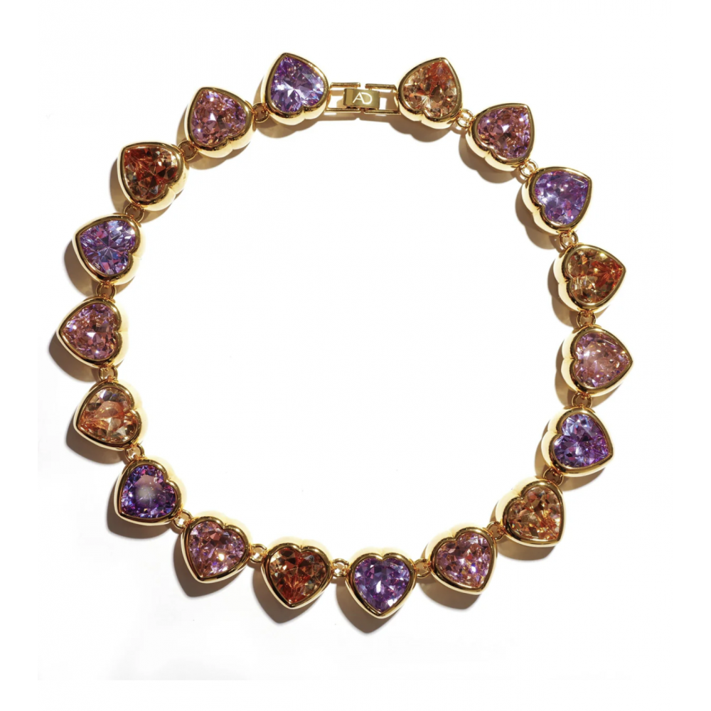 Ce collier signé Alexia Demblum est en laiton plaqué or 18 carats, orné de zircones cubiques sculptées à la main en forme de cœurs. Les pierres, de couelurs pastel sont subtilement agencées pour capter la lumière et ajouter une touche de glamour à votre tenue. Un design élégant et romantique, parfait pour sublimer chaque occasion.