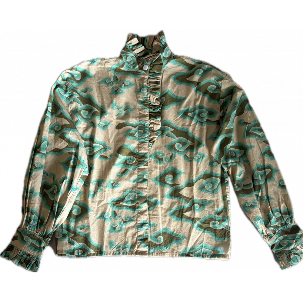 Retour à la nature avec cette magnifique blouse en coton organique imprimé d'un motif vert ! De part sa confection artisanale, chaque pièce est unique. Son col montant volanté peut également s'ouvrir pour davantage de décolleté.
