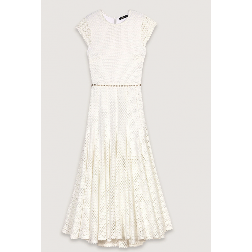Une silhouette légère et aérienne se dévoile dans cette robe longue en matière ajourée, munie d'une doublure courte. Dotée de petites manches et d'une ceinture bijou soulignant la taille, elle affiche une jupe volumineuse et évasée.