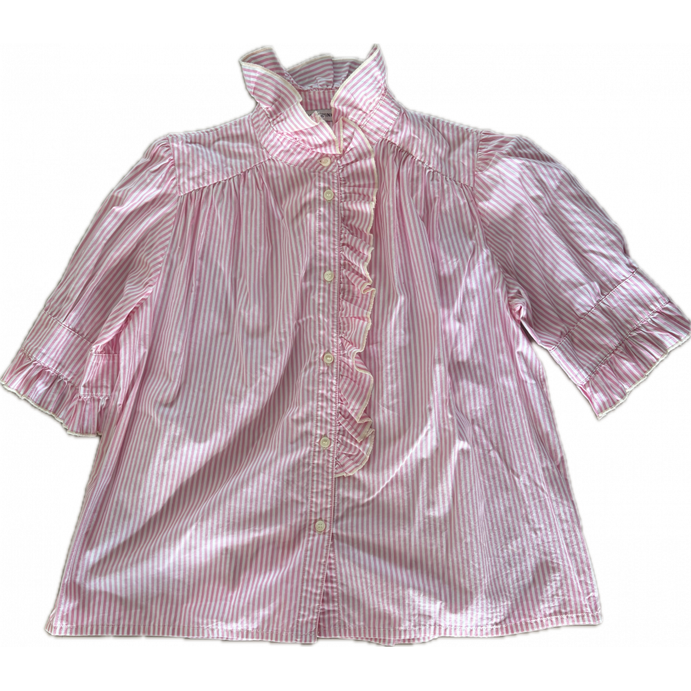 Manches courtes à volants, coupe droite et ample. Un volant froncé souligne tout le contour de l’encolure et se prolonge le long de la patte de boutonnage. Bord fini par un point de bourdon. Boutonnage milieu devant sur toute la longueur, petits boutons nacrés. Le col peut se porter ouvert ou fermé, pour deux silhouettes différentes.