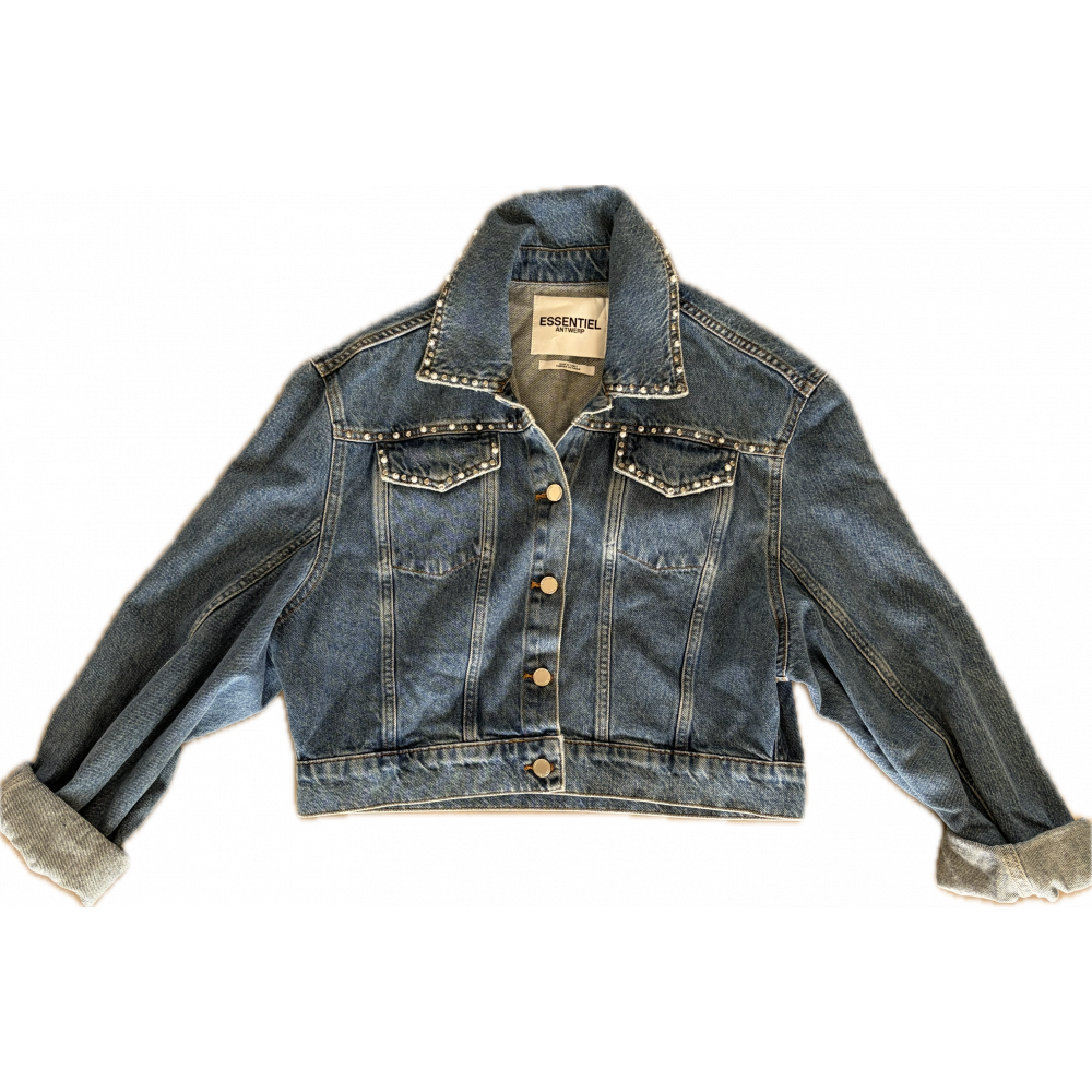 Courte veste en jean, dotée de deux poches plaquées, de boutons ton-sur-ton et d'une emmanchure basse qui accentue sa coupe décontractée. Les poches et le col sont agrémentés de perles et de clous, créant une allure raffinée mais audacieuse.